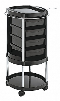 Оборудование | Тележки парикмахерские, стойки | Тележка Элегансия Серебро/Черный/КрасныйПередвижная парикмахерская тележка на колесах. Материал - пластик. На верхней панели тележки расположены отверстия для брашеров, держатель для фена и полотенец. Тележка имеет четыре выдвижных ящика, внизу - открытая полка.
