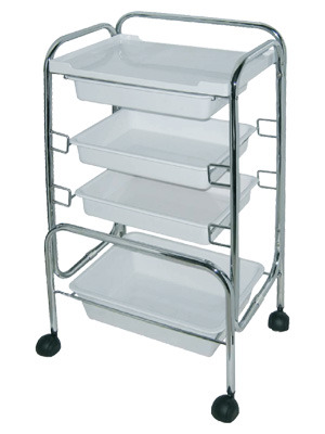 Тележка косметолога на металлическом хромированном каркасе с четырьмя пластиковыми полочками с бортиками разной глубины.